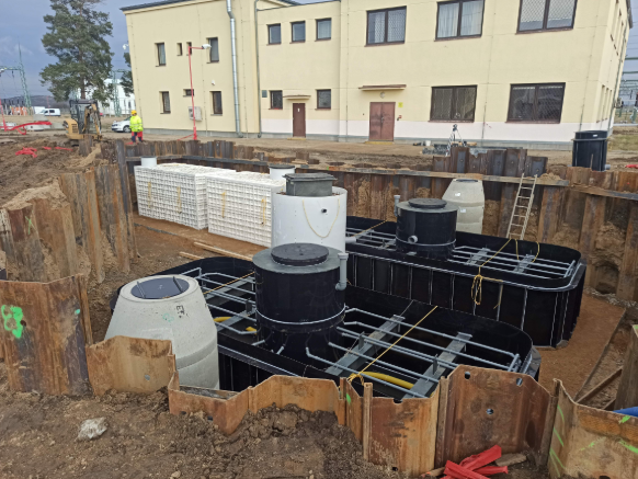 - Výstavba dešťové kanalizace s odlučovačem ropných látek pro stání traf a tlumivek